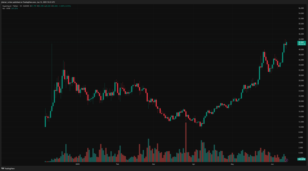 قراءة ذات صلة: بنك أوف أمريكا سينظر في العملات المستقرة بعد تمرير قوانين التشفير الحاسمة، كما أعلن الرئيس التنفيذي. في وقت النشر، تساوي 10,000 HYPE أكثر من 420,000 دولار وتمثل أكبر حصة لشركة مدرجة في هذه المنصة المالية اللامركزية. تم إطلاق Hyperliquid في أواخر عام 2024، وقد حظيت باهتمام كبير في مجال التشفير بسبب حركة سعرها الإيجابية؛ حيث ارتفع HYPE من 1 دولار إلى حوالي 42 دولار في أقل من عام.