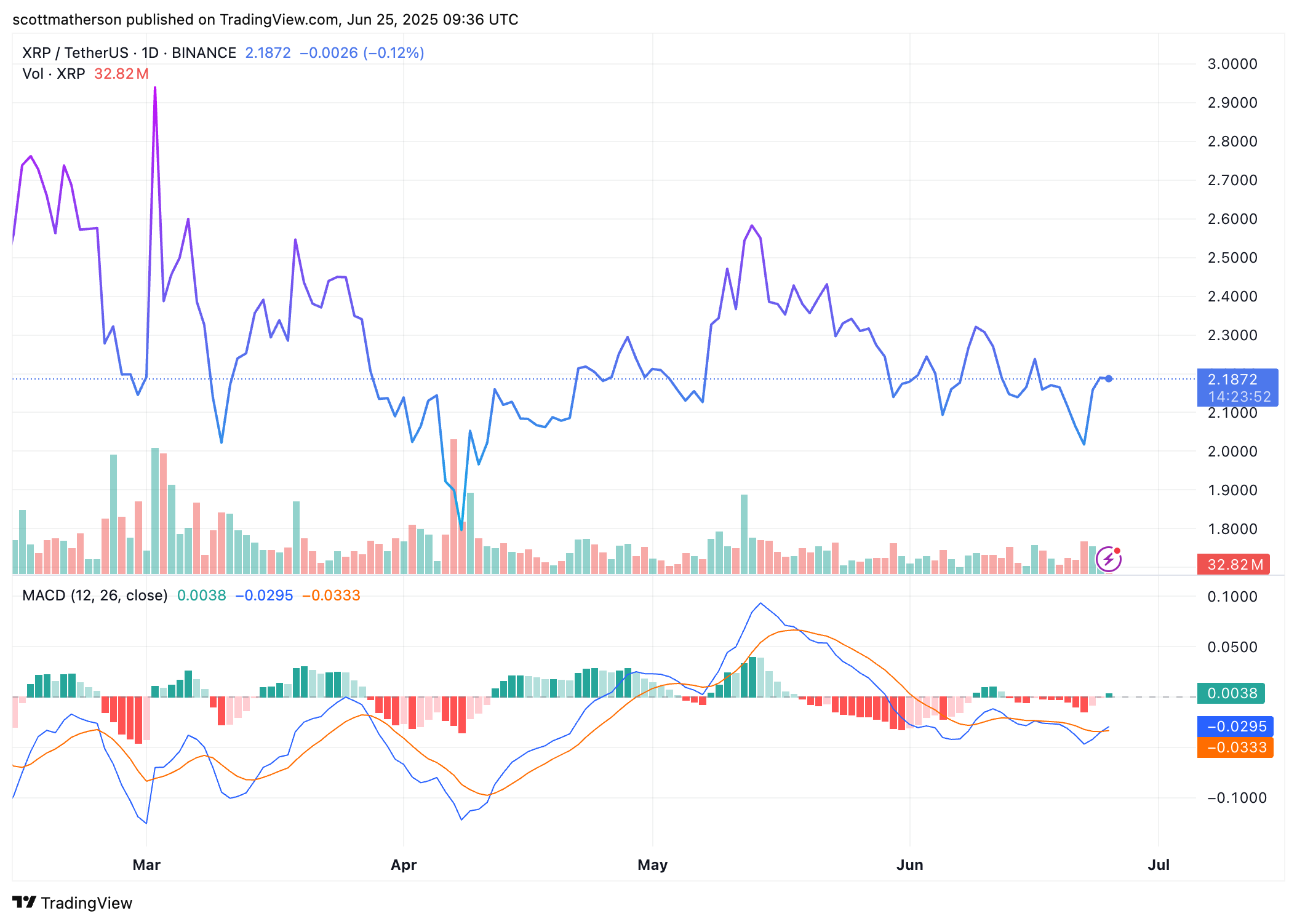 من المثير للاهتمام أن Dark Defender أشار إلى أن شهري يونيو ويوليو من المتوقع أن يكونا “فترة ساخنة” ل XRP. يراقب المحللون عن كثب علامات الاختراق خلال هذين الشهرين، وذلك أساسًا لأن سعر تداول XRP أعلى بقليل من مستوى الدعم الطويل الأمد الذي يتراوح بين 2.07 دولار و 1.88 دولار. تظل هذه المستويات قوية خلال الانخفاضات الأخيرة، وهي متوافقة مع مستوى تصحيح فيبوناتشي بنسبة 26.3% من الدورة السابقة.