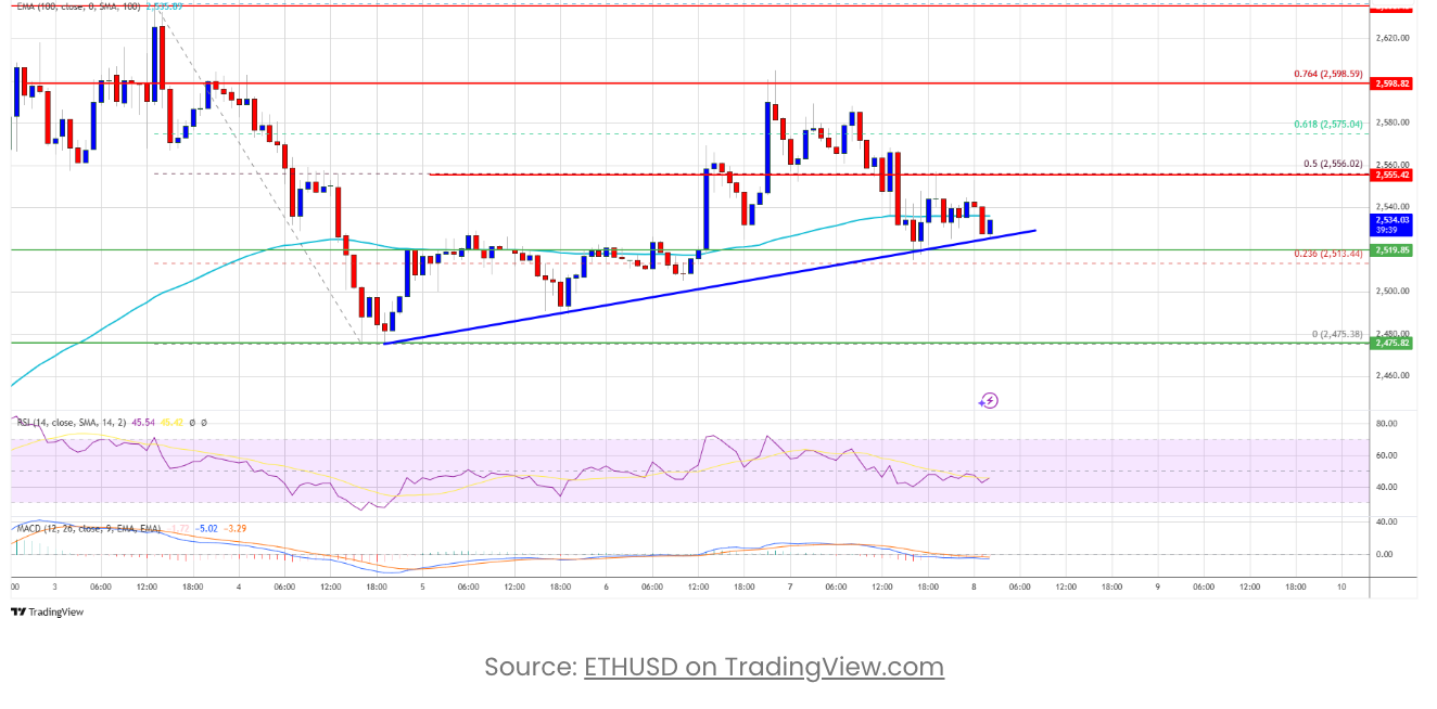 مستوى الدعم الرئيسي يتم اختباره مشابهة لبيتكوين، تمكن إثيريوم سابقًا من اختراق منطقة $2,550 (اتجاه ETH/USD). تسارع السعر صعودًا، وتمكن من الارتفاع فوق مستوى المقاومة $2,565، ودخل المنطقة الصاعدة.