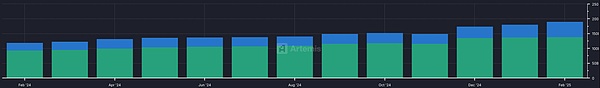 بحلول فبراير 2025 ، بلغ عرض العملات المستقرة 214 مليار دولار أمريكي ، وبلغ حجم المعاملات السنوي 35 تريليون دولار أمريكي ، وهو ما يعادل ضعف حجم معاملات Visa السنوية. ارتفعت النشاط في السوق بشكل متزامن ، وارتفع عدد العناوين النشطة على السلسلة بنسبة 53٪ ، متجاوزًا 30 مليون. تتدفق الأموال المؤسسية بشكل كبير ، مما يعزز اندماج التمويل التقليدي (TradFi) مع سوق العملات المشفرة.