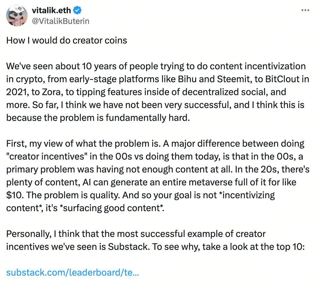 وبالمقارنة، يرى فيتاليك أن منصة Substack التقليدية هي الآن أنجح نموذج لتحفيز المبدعين. حلل المبدعين في مجالات التكنولوجيا والثقافة والسياسة العالمية الذين يحتلون مراكز متقدمة على المنصة، واكتشف أن هؤلاء يكتسبون الاعتراف من خلال جودة المحتوى.