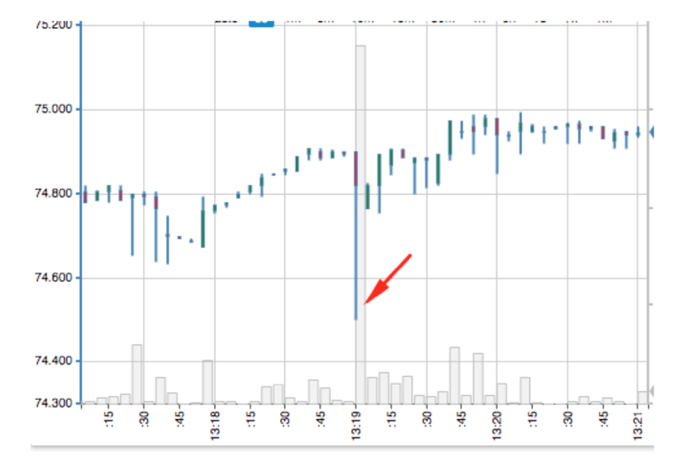 مثال على أمر بيع غير فعال، الذي تجاوز الفارق وتخطى عدة مستويات من دفتر الأوامر المحدودة، تلاه تعافٍ سريع.