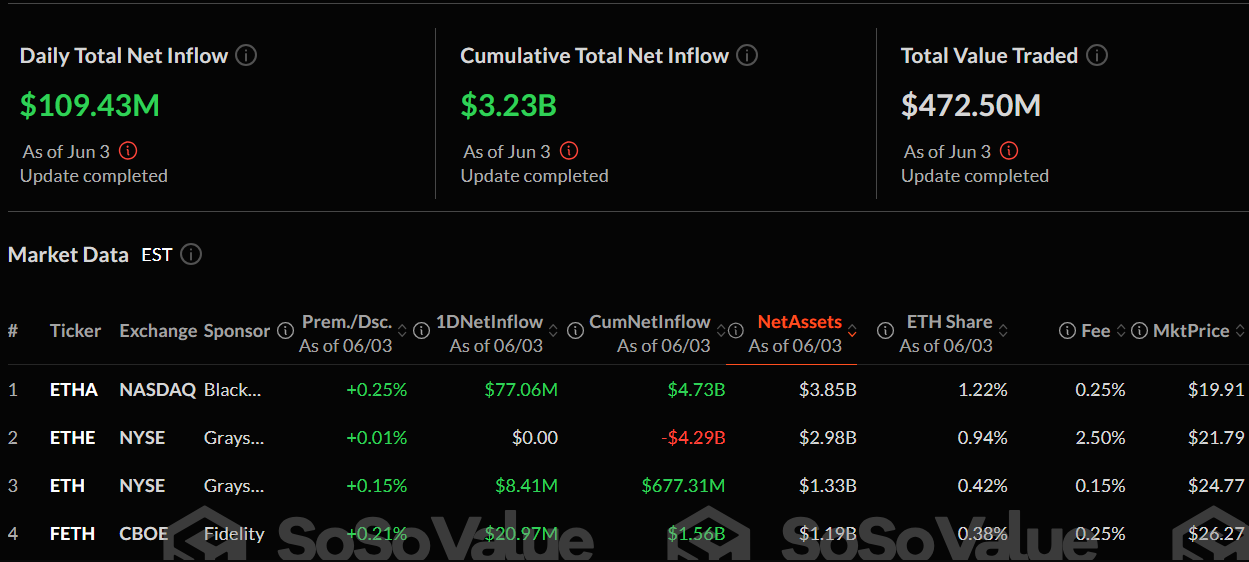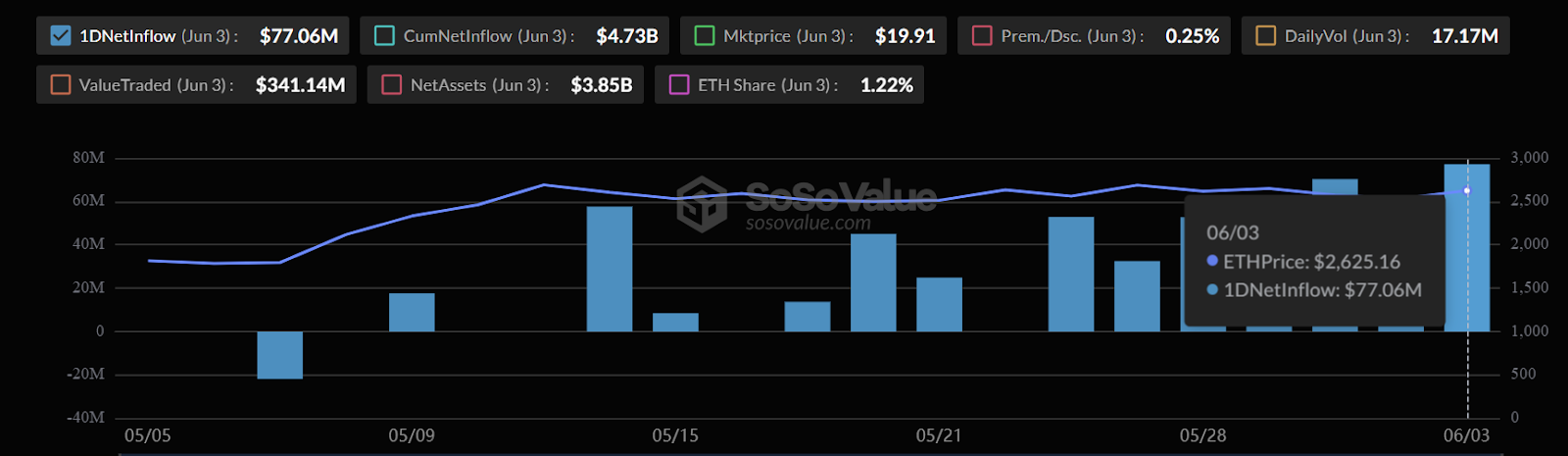 Los fondos cotizados en bolsa de Ethereum (ETFs) sido testigos de una notable afluencia de capital institucional el 3 de junio de 2025, lo que indica un cambio en el sentimiento de los inversores y la estrategia de activos. Entre los de mejor rendimiento, el ET (ETHA) F iShares Ethereum Trust de BlackRock registró una entrada en un solo día de USD 77.06 millones, lo que contribuyó significativamente a la entrada total de USD 109.43 millones de ETF para Ethereum el martes.