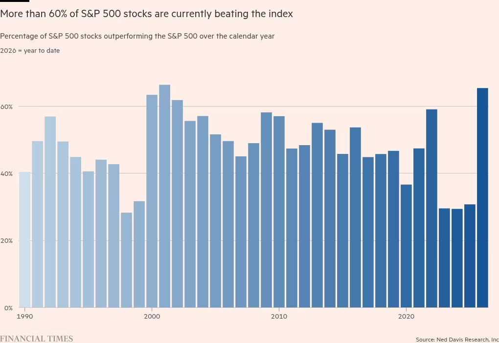 Pero hasta ahora este año, más del 60 por ciento de las acciones del S&P han superado al índice en su conjunto — el rango más amplio en décadas.