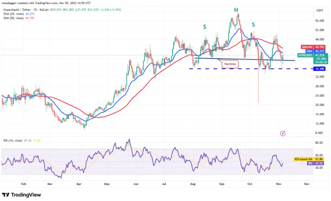 Harga Hyperliquid (HYPE) telah turun di bawah garis leher (neckline) pada hari Selasa, tetapi menemukan dukungan di level penting 35,50 USD.