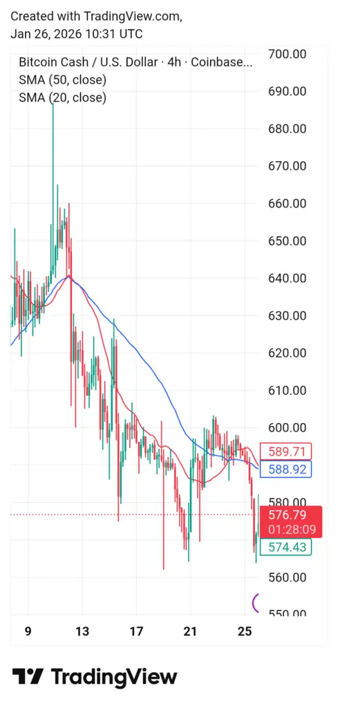 Bitcoin Cash (BCH) diperdagangkan sekitar $579 saat penulisan pada hari Senin, 26 Januari.