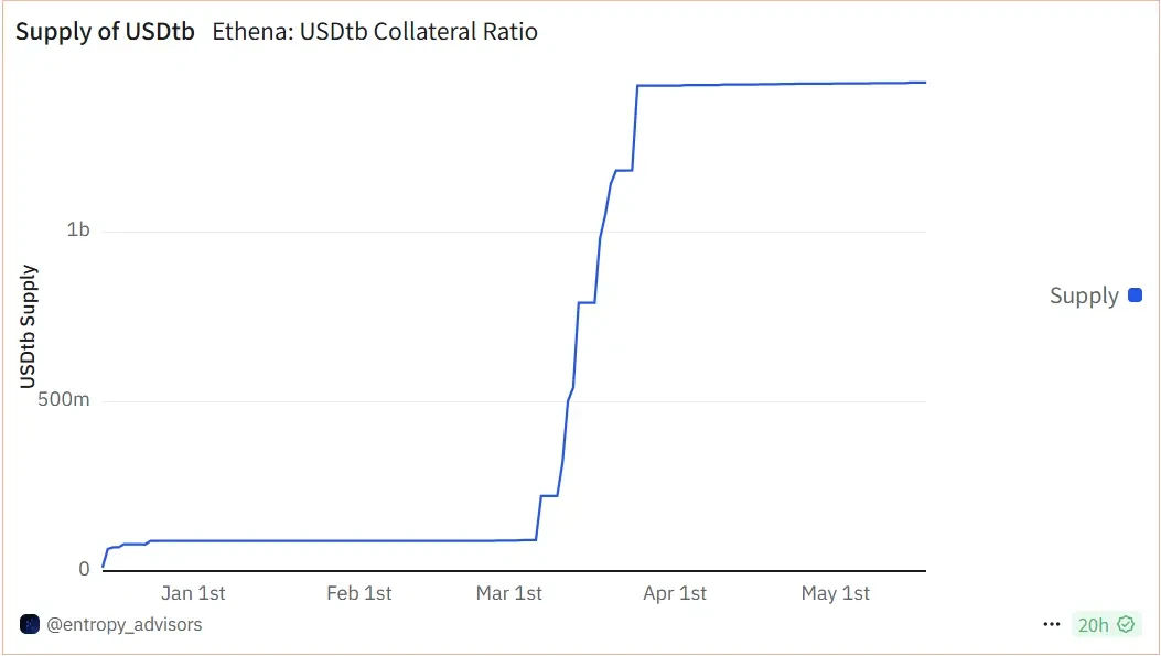 USDtbは無収益だが全額担保されたステーブルコインで、資産はブラックロックのトークン化マネーマーケットファンド(BUIDL)とUSDCで構成されています。現在のオンチェーン供給は14億4000万ドルを超え、担保率は99.4%を維持しています。USDeの戦略的ヘッジとは異なり、USDtbは「オンチェーンドル」に似ており、機関に信頼できる、変動のない安定したアンカーを提供します。特に市場で負の金利が発生した場合、EthenaはUSDeのヘッジ資金をUSDtbに移動させ、全体の資産プール構造を安定させることができます。
