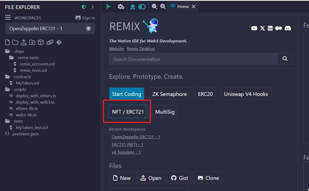 テストのためには、自分のNFTを持つことが最良です。Remixを使って、ERC-721プロトコルのNFTを迅速に構築でき、対応するテンプレートが提供されています。