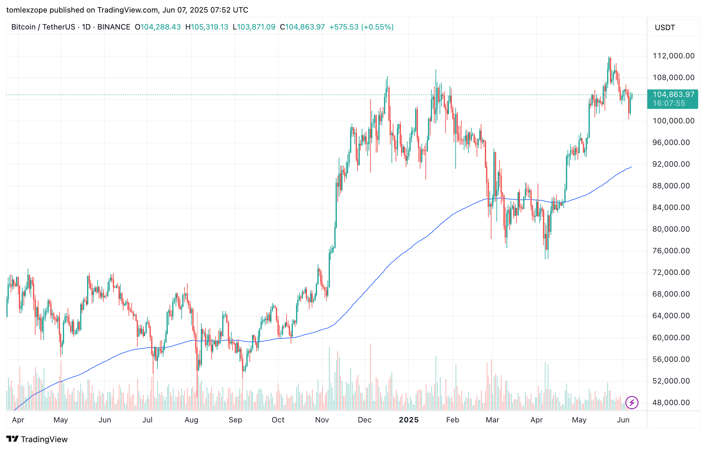 日足でのBTCの価格 |出典:TradingViewのBTCUSDTチャート