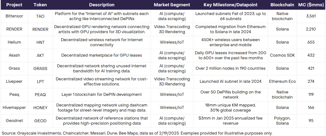 グレースケールは、2025年初頭にリリースされたDePIN調査レポートで、上位のDePINプロジェクトの市場価値を示しています。 2022年以降、DePINとAIは、暗号通貨投資の2つの新しい方向性として密接に関連しています。 しかし、これまでのところ、DePINスペースには真に象徴的なプロジェクトが不足しているようです。 Heliumはヘッダープロジェクトですが、DePINの概念よりも前から存在しています。 Bittensor、Render、Akash は、AI トラックとしてより分類されます。