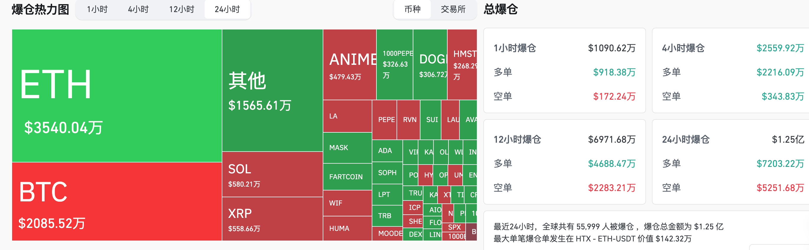 24時間強制清算データ:世界中で55999人が強制清算され、強制清算の総額は1.25億ドルで、そのうちBTCの強制清算は2085万ドル、ETHの強制清算は3540万ドル、SOLの強制清算は580万ドルです。