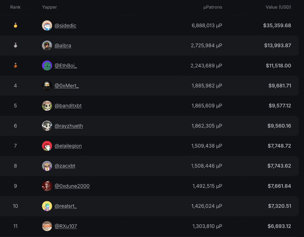 INFINEXの活動はシーズンごとに開催され、賞金総額は約600万ドル相当で、シーズン0は約60万ドル相当、現在はシーズン1で約90万ドルの賞金が支払われています。 ユーザーは、コンテンツ作成と招待メカニズムを通じてポイントを競い合い、uPatronsの報酬を獲得します。 各シーズンに割り当てられるポイントと報酬は徐々に増加します: シーズン0の上位3人のプレイヤーは、それぞれ10,000ドルから35,000ドルを受け取ります。 トップ 10 の賞金は $7,000 以上です。 上位 138 名には $1,000 以上の賞金が贈られます。 シーズン1から150MuPatrons(約$900,000)が配布され、その後のシーズンではさらに多くの報酬が配布されます。 同時に、uPatronsの20%はGenesis NFTの保有者とステーカーに帰属し、一部はInfinexのエアドロップを通じて配布されます。