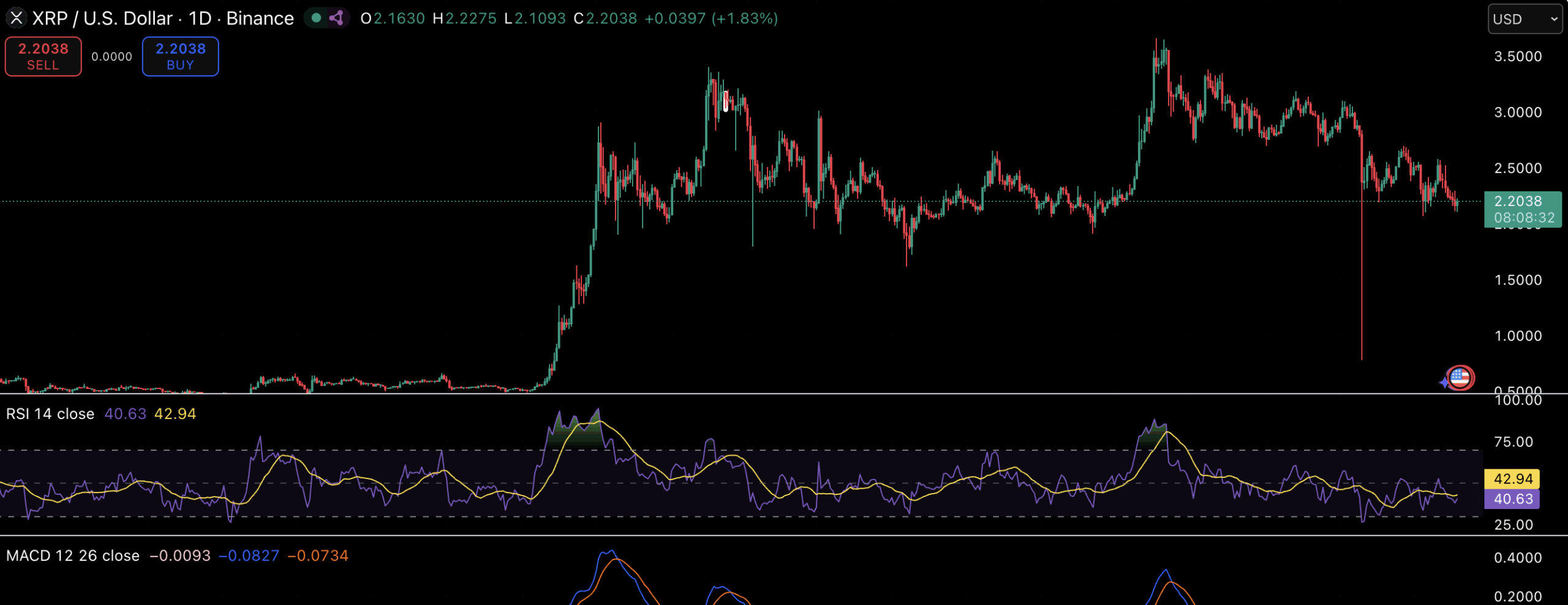 XRPを追跡しているチャートアナリストは、価格の動きが長期の下降チャネルの下限に密着していることを指摘しています。週ごとのRSIは中立的-弱気ゾーンにとどまり、MACDのモメンタムは弱いままであり、購入の確信が減少していることを示しています。