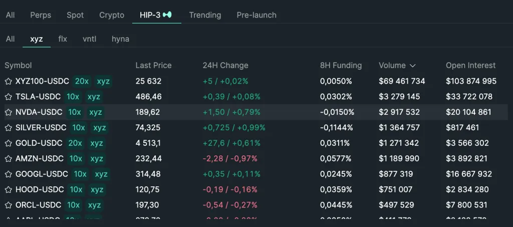 執筆時点で、プラットフォームには4つのセグメントが稼働しています:xyz (trade.xyz)、flx (Felix Protocol)、vnti (Ventuals)、hyna (HyENA)。これらは、テクノロジー企業のトークン化された株式、株価指数、実験的資産、レバレッジ最大25倍の暗号通貨に焦点を当てています。