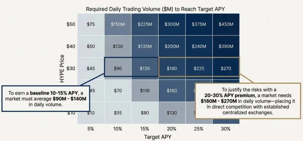 競争力を保つために、新しいHIP-3のLSTは20〜30%のAPYを提供する必要があります。しかし、そのような支払いを確保するには、「天文学的」な取引量が必要です。HYPEの価格が上昇すると、必要な取引高は指数関数的に増加します。