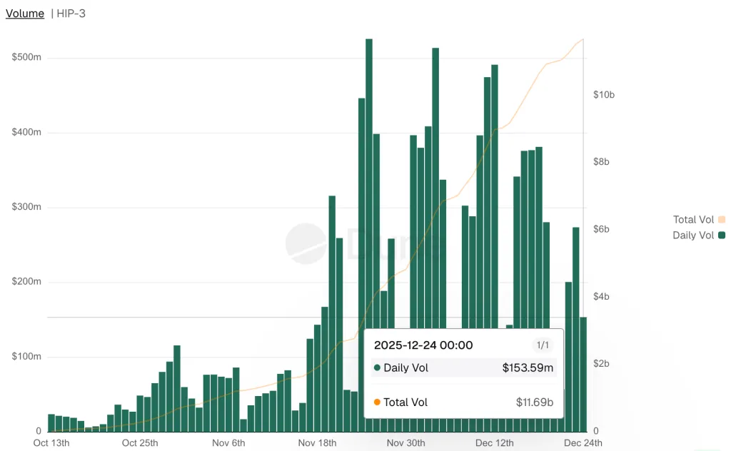 HIP-3のカスタムマーケットの総取引高は11.69億ドルを超えました。直近24時間の取引高は1億5350万ドルで、ピーク時には5億2590万ドルに達しました。