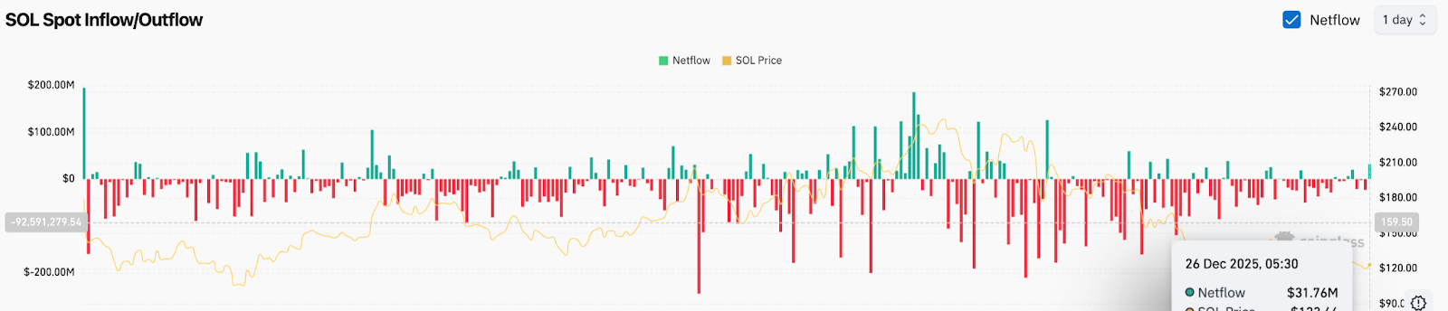 スポット流入データは、やや改善を示している。12月26日に、Solanaは約3170万ドルの純流入を記録し、価格は$123.5付近で取引されていた。これは急増ではないが、10月と11月に見られた大量の流出からの変化を示している。