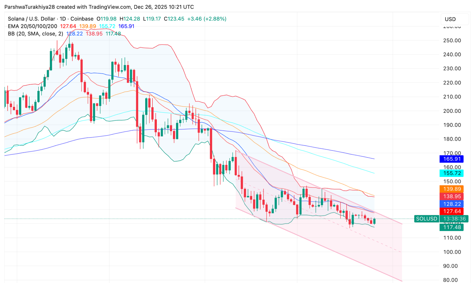 SOLは最近の安値から控えめに反発し、$123.4付近で取引されているが、より広範な修正構造内に閉じ込められている。価格は短期サポートの$120付近を上回っているが、売り手がトレンドを支配し続けており、下降EMAの積み重ねの下で取引されている。緊張は、安定化が底を形成できるか、それとも下落トレンドが再開するかに集中している。