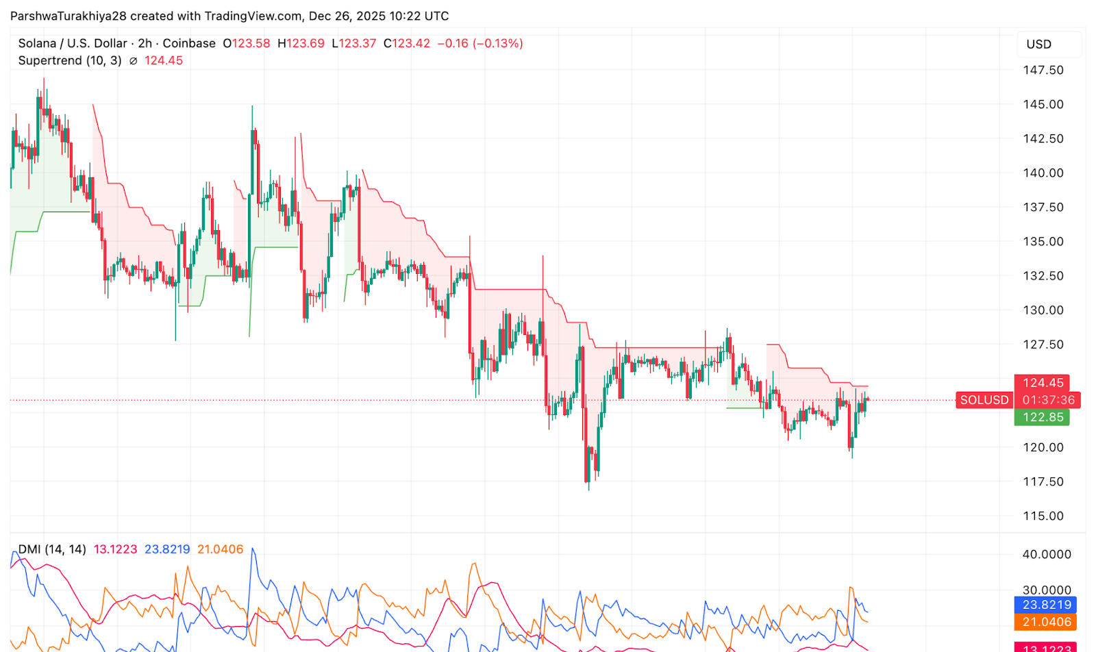 2時間足チャートでは、SOLは$122を上回る短期的な底を築こうとしている。Supertrendは$124.4付近で弱気を維持し、上昇試みを抑制している。価格がそのレベルを超えるまでは、イントラデイの勢いは中立から弱いまま。