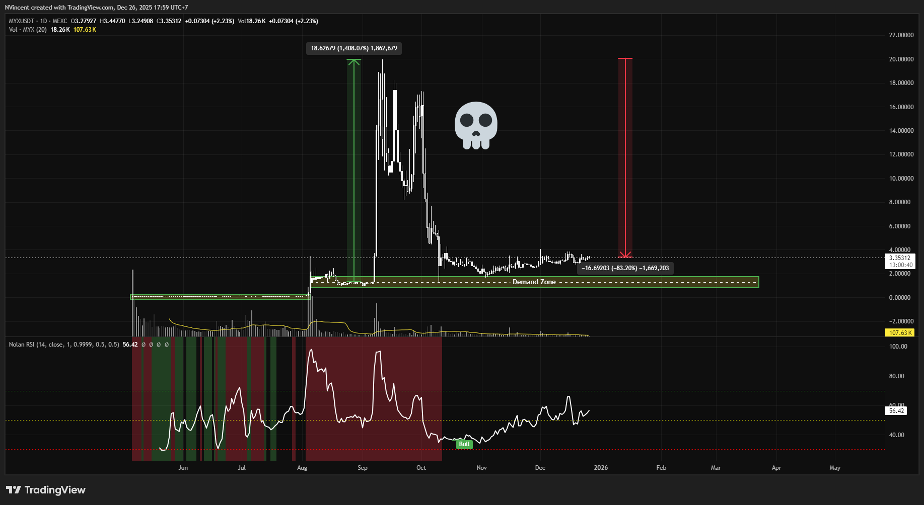 スペクトルのもう一方の端では、$MYX、$SYRUP、そして$MORPHO のような小型トークンが断続的にアウトパフォーマンスを示しています。これらの動きは、主に短期的なインセンティブや投機的な期待によって駆動されており、持続的な機関投資の蓄積の証拠は限られています。機関投資家の観点からは、これらは戦術的な取引機会として扱うべきであり、戦略的なコア保有としては適していません。