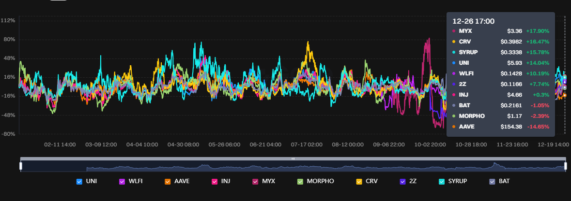 チャートの観察から、DeFi内の分散はAIやミームなどのセクターよりも実質的に低いことが示されています。主要なトークンには$UNI、$AAVE、$CRV、$INJ、そして$BAT が含まれ、これらは類似の特性を示しています:ボラティリティの圧縮、一時的な上昇動き、そして迅速な平均回帰です。この行動は、DeFiのキャッシュフローポテンシャルを認識しつつも、短期的な触媒が意味のあるセクター全体の再評価を引き起こすには十分であると確信していない市場を反映しています。