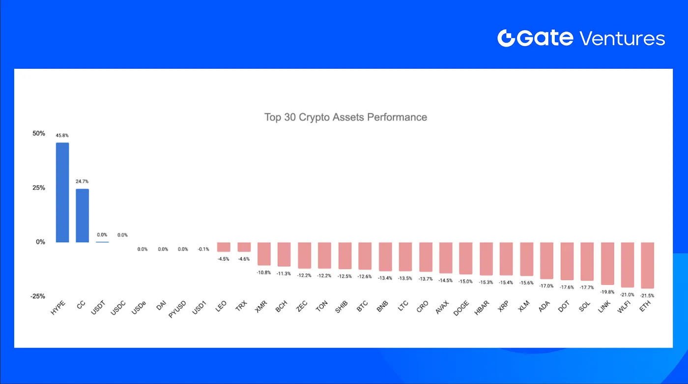 時価総額トップ30の暗号通貨は今週平均8.5%下落し、HyperliquidとCanton Networkのみが上昇した。