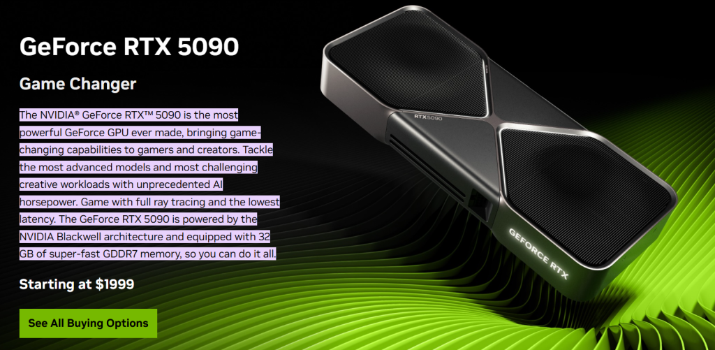 これらのマイクロチップは、NvidiaのゲーミングラインナップGeForce RTX 5090に搭載されている。2025年1月に発表されたこのGPUは依然としてトップの座にあり、1,999ドルとされた価格も現実離れしている。記事執筆時点では、提案価格は4000〜5000ドルの範囲にある。