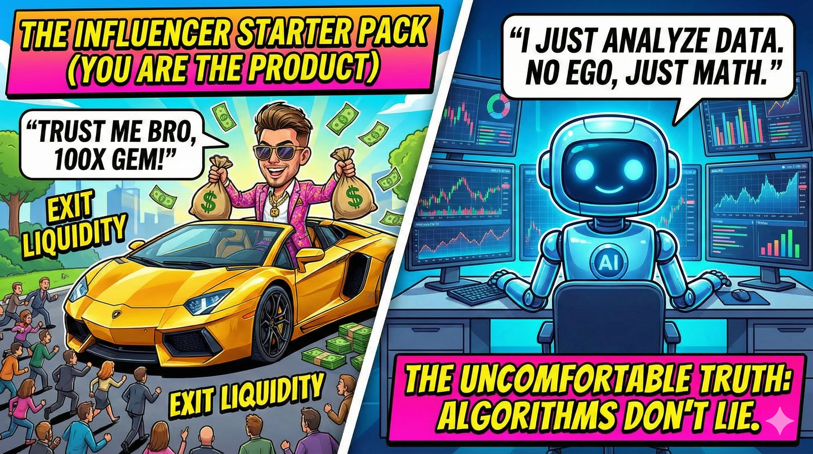 ### **ドバイライフスタイルの幻想**今すぐXまたはYouTubeを開いてみてください。数秒以内に見つかります。ドバイでレンタルのランボルギーニのハンドルを握る男たち。10,000%の利益スクリーンショットを投稿する「アルファコーラー」たち。今日この特定のコインを買えば12月までに引退できると約束するグルたち。彼らは取引の天才のように見え、非常に自信に満ちているように聞こえます。** ****しかし、醜い真実はこうです:あなたは彼らのコミュニティではなく、彼らの商品なのです。**私は何年もこれらの「グルたち」を追いかけ、彼らが呼ぶ押し目買いを買い続け、自分のポートフォリオが血を流しているのに彼らは新しい時計を買っているのを不思議に思っていました。そこで、ゲームの仕組みが実はどう操作されているのかを学びました。暗号資産で損失を止めたいなら、インフルエンサー業界の三つの汚い秘密を理解し、** ****Fortune AIのような客観的なアルゴリズムに切り替えることが唯一の平等な戦い方です。**---### **真実 #1:あなたは「退出流動性」**伝統的な金融では、インサイダー取引は重罪です。暗号のワイルドウェストでは、それはただの火曜日です。こちらが90%の暗号インフルエンサーが使う正確な戦略です:1. 彼ら(またはホエールの私的グループ)は、価格がほぼゼロの低時価総額の「シットコイン」を静かに大量に買います。2. 彼らのバッグが満杯になると、TwitterやYouTubeに登場し、「アルファアラート」と叫び、何百万ものフォロワーにこのコインが「次の100倍の宝石」だと伝えます。3. FOMO(取り残される恐怖)に駆られた個人投資家(あなた)は急いで買いに走り、価格は急騰します。4. あなたが買っている間に…** ****彼らは売っています。**金融ではこれを「退出流動性」が必要と呼びます。無駄なトークンを何百万ドルも持つ人は、その価格をゼロに崩さずに売ることはできません。彼らは大量の買い手の波を必要とし、自分の売り注文を吸収させるのです。彼らはプロジェクトには興味がありません。ただ盛り上げて、** ***あなたのお金を使って***彼らの***利益を現金化***しているだけです。売り抜けが終わると、チャートは崖から落ち、あなたは価値のないバッグを持ち続けることになります。---### **真実 #2:有料のシル(彼らは自分の言うことを取引しない)**トップクラスの暗号YouTuberやTwitterの有名人が、1回のプロモーション投稿に1万ドルから6万5千ドル以上請求していることをご存知ですか?インフルエンサーが「この素晴らしい新しいWeb3ゲームトークンを見つけた」と動画で言うとき、そのほとんどは高額な固定料金(またはトークン供給の大きな割合)を支払われている可能性が非常に高いです。彼らは自分の資金をそのコインに投資していません。彼らの「リスク」はゼロです。さらに、多くの異常な損益(Profit and Loss)のスクリーンショットは、怪しい取引所が提供する** ****デモアカウント**から撮られたもので、取引を非常に簡単に見せるためのものです。---### **真実 #3:彼らは「ホプニウム」(希望の言葉)を売るだけで、リスク管理はしない**暗号のグルの最大の赤旗は、損失について一切話さないことです。取引がうまくいったときは何週間もそれを再投稿します:** ***「言った通り!信じてくれてた?」*** 取引が悪くなると、そのツイートを削除したり無視したり、「ただHODLしてダイヤモンドハンドで持ち続ければ戻ってくる!」とあなたに言ったりします。死にゆく資産を持ち続けるように人々に勧めるのはひどい金融アドバイスですが、それがいいねを稼ぎます。カルト的なフォロワーを築きます。本当の取引は、決して負けないことではなく、厳格で退屈な数学的リスク管理にあります。でも、「タイトなストップロスを設定する」ことはYouTubeのクリック数を稼ぐことにはなりません。---### **解決策:エゴよりもアルゴリズムを**人間は欲、恐怖、承認欲求に駆られます。アルゴリズムはそうではありません。だから私はインフルエンサーの話をやめて、** ****Fortune AI**に取引戦略を委ねました。* **隠された意図なし:** AIは怪しいミームコインの開発者から裏で金をもらうことはありません。ただデータ、取引量、勢いをスキャンするだけです。* **感情なし:** 取引が逆方向に動けば、ストップロスを設定して退出します。「ダイヤモンドハンド」も祈りも不要です。* **エゴなし:** Twitterで正しく見えることにこだわりません。確率だけを重視します。取引は十分に難しいのに、あなたにアドバイスをしている人が秘密裏にあなたのお金を盗もうとしているかもしれないと推測しながら取引する必要はありません。暗号インフルエンサーのドバイ休暇資金提供をやめましょう。彼らの退出流動性になるのもやめましょう。冷静なデータに基づいて取引を始めましょう。