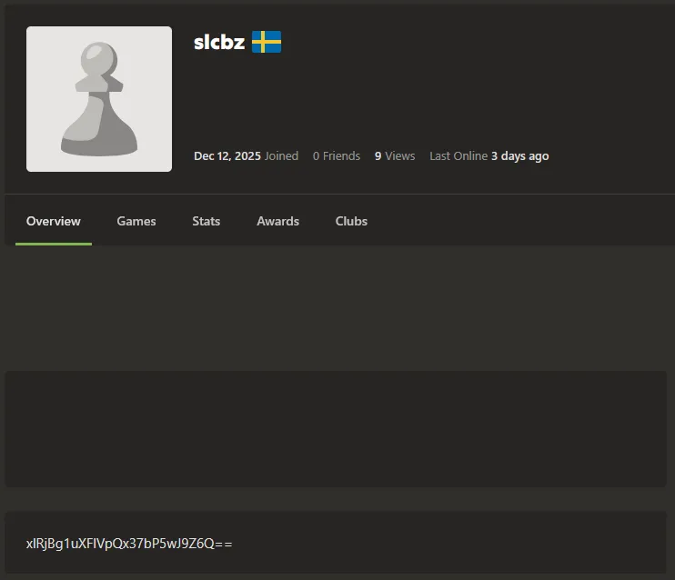 Chess.comユーザープロフィールのabout欄。出所:Solar 4RAYS。各プラットフォームにはそれぞれ異なるマーカーのセットが使われます。たとえばChess.comの場合、ユーザープロフィールのabout欄です。抽出された文字列はデコードされ、サーバーのドメインに変換されます。