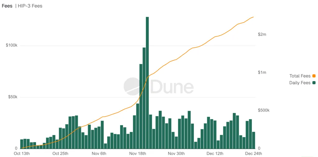 HIP-3のアップデートにより、プラットフォームはユーザーが無期限のコントラクトのシンセティックマーケットを立ち上げることを可能にしました。そのためには、500,000 HYPEをステーキングする必要があります。すべての取引手数料は参加者間で分配されます。