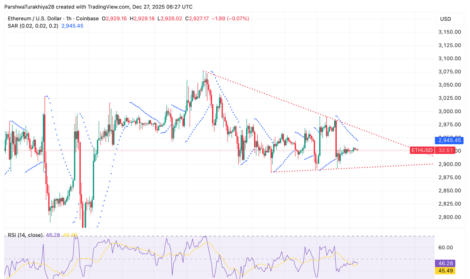 On the one-hour chart, ETH is compressing inside a narrowing range between $2,900 and $2,980. Parabolic SAR dots remain above price, keeping short-term pressure intact, while RSI hovers in the mid-40s, reflecting neutral momentum.