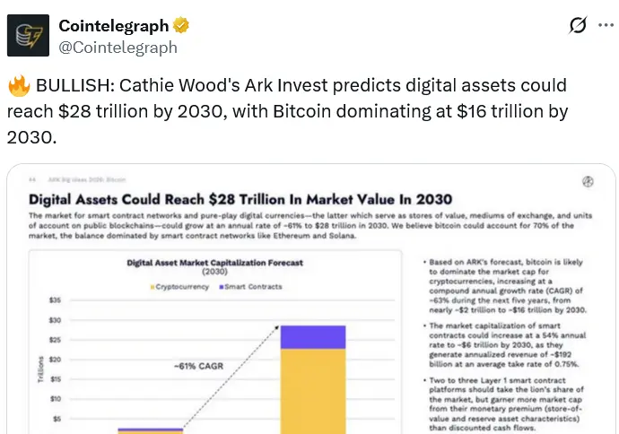 ARK estimated in its “Big Ideas 2026” report that the crypto market would expand at a 61% compound annual growth rate (CAGR) to meet the $28 trillion target by 2030, adding that Bitcoin could account for 70% of that figure.