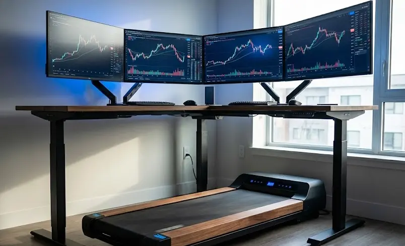 Esteira sob a mesa: minha arma secreta. Durante o lazer, caminhar lentamente mantém o cérebro bem irrigado, aumentando a clareza de pensamento e a produtividade.
