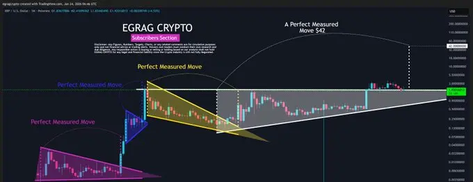 He pointed to XRP’s historical trading patterns, noting that previous long-duration consolidation phases were followed by expansions that closely matched their projected measured moves. According to his analysis, those past cycles showed a high degree of precision, which he sees as evidence of repeatable market behavior.