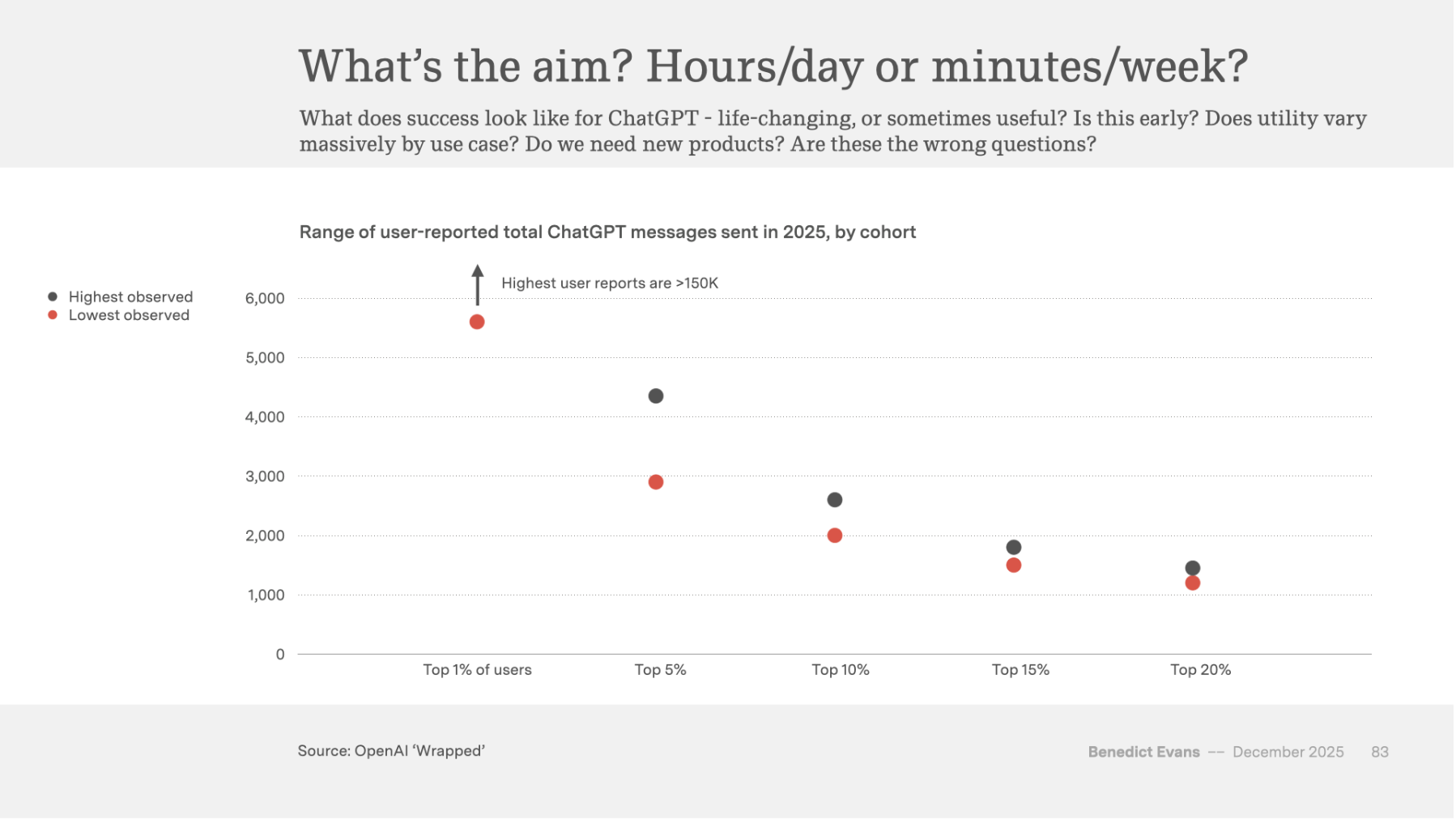 Evans notes that OpenAI’s current business model does not have a clear competitive advantage. The company neither possesses unique technology nor has formed network effects. Only 5% of its 900 million weekly active users are paying, and 80% of users sent fewer than 1,000 messages in 2025—equivalent to less than three prompts per day on average. This “one mile wide, one inch deep” usage pattern indicates that ChatGPT has not yet become a daily habit for users.