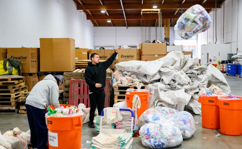 Workers sift through recyclables at the Ridwell central warehouse in San Leandro, Calif., on Feb. 12, 2026.