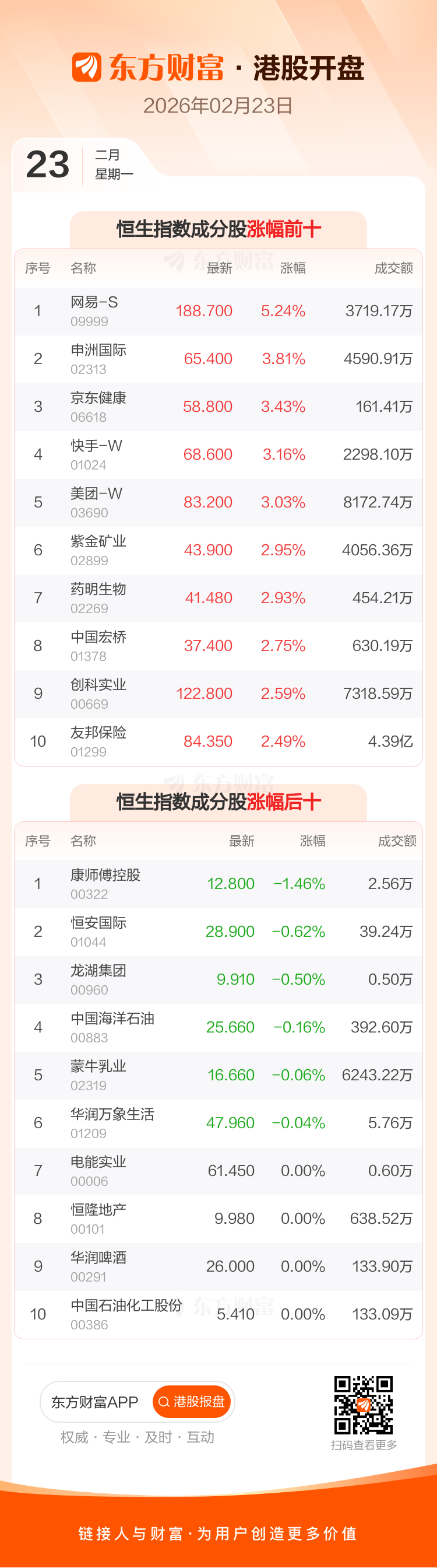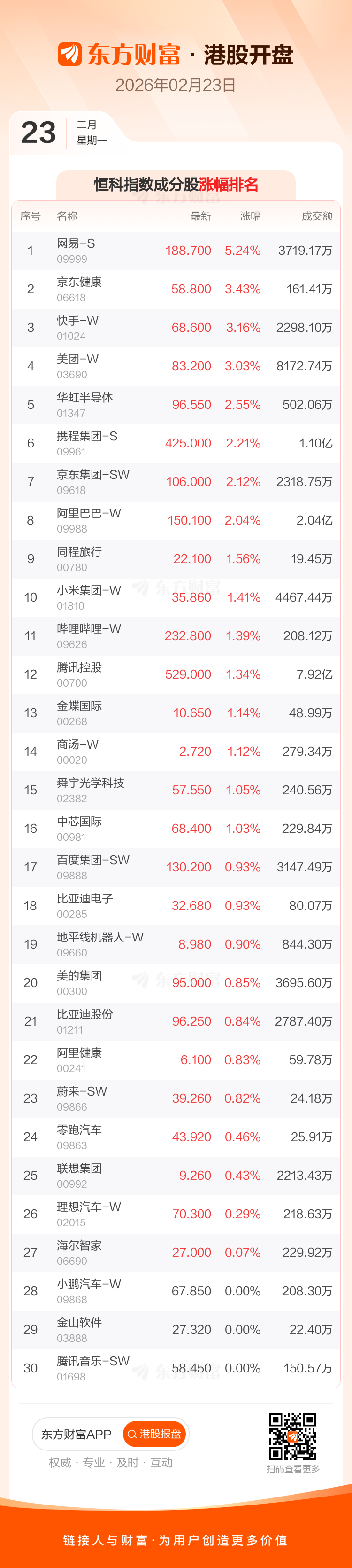 Hong Kong stocks opened higher on February 23. The Hang Seng Index opened at 26,798.97 points, up 385.62 points, a 1.46% increase; the Hang Seng Tech Index opened at 5,303.5 points, up 92.0 points, a 1.77% increase. Among the Hang Seng Index constituents, NetEase-S, Shenzhou International, and JD Health saw the largest gains, while Master Kong Holdings, Hengan International, and Longfor Group experienced the largest declines. Among the Hang Seng Tech Index components, NetEase-S, JD Health, and Kuaishou-W led the gains.