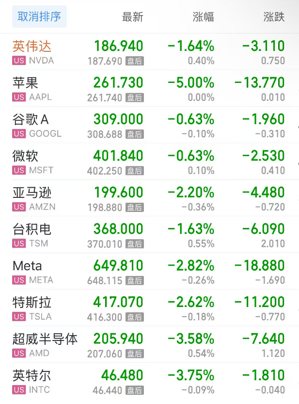 Among hot stocks, Nvidia fell 1.64%, Apple dropped 5.00%, Google C declined 0.63%, Google A down 0.63%, Microsoft fell 0.63%, Amazon declined 2.20%, TSMC dropped 1.63%, Meta fell 2.82%, Tesla declined 2.62%, Advanced Micro Devices (AMD) fell 3.58%, Intel dropped 3.75%.