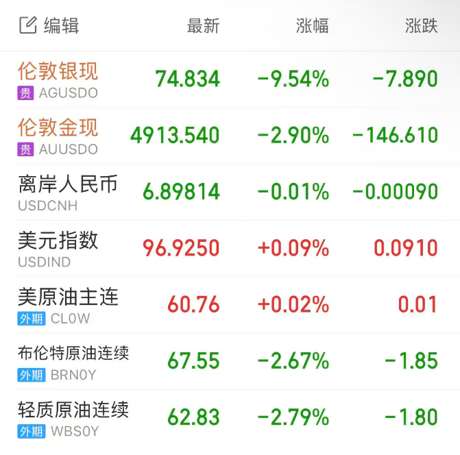 Due to traders selling metals to cover stock losses, spot gold plunged intraday, with London gold ending down 2.7% at $4,921 per ounce; spot silver fell more sharply, briefly breaking below $75 per ounce, with London silver closing down 9% at $75.2 per ounce.
