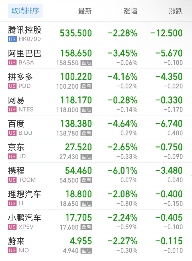 Among popular Chinese concept stocks, Tencent Holdings (HK) fell 2.28%, Alibaba dropped 3.45%, Pinduoduo declined 4.16%, NetEase fell 0.28%, Baidu declined 4.64%, Ctrip fell 6.01%, Li Auto dropped 2.08%, Xpeng Motors declined 2.24%, NIO fell 2.27%.