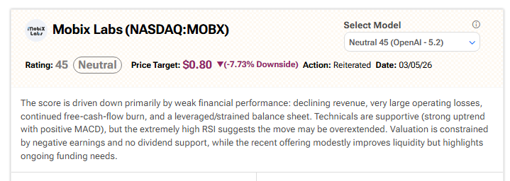 Turning to Wall Street, analyst coverage of Mobix Labs stock is lacking. Fortunately, TipRanks’ AI analyst Spark has it covered. Spark rates MOBX stock as Neutral (45) with an 80-cent price target. It cites “weak financial performance (declining revenue, very large operating losses, continued free-cash-flow burn)” as reasons for this stance.