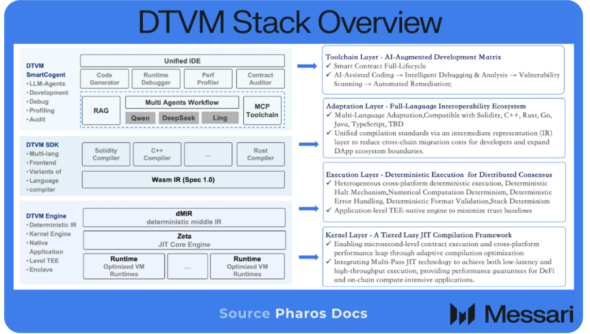 • Pharos unifies EVM and WASM into a deterministic virtual machine (DTVM), allowing Solidity contracts to natively call Rust contracts without cross-chain bridges or cross-VM overhead.