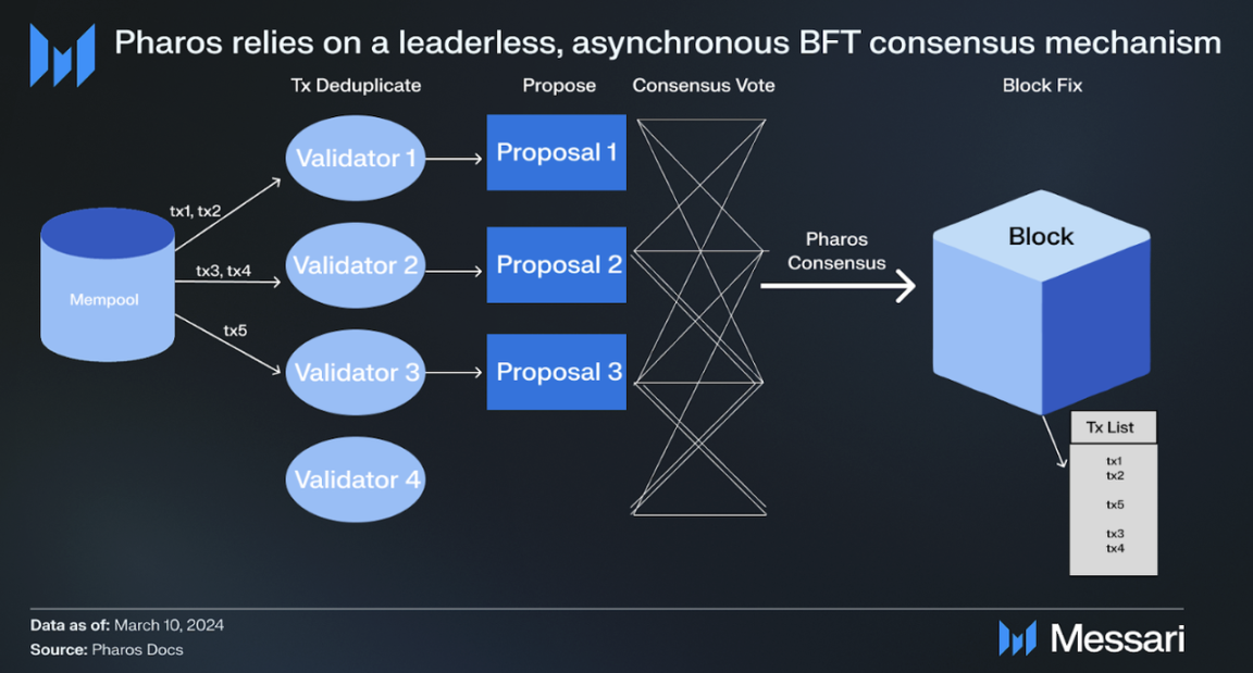 Traditional Byzantine Fault Tolerance (BFT) consensus relies on single-node proposal blocks, which limits performance and risks single points of failure. Pharos breaks these limits with an asynchronous BFT protocol that does not depend on fixed time assumptions. Validation nodes can dynamically advance based on real network conditions rather than passively waiting for timeouts.