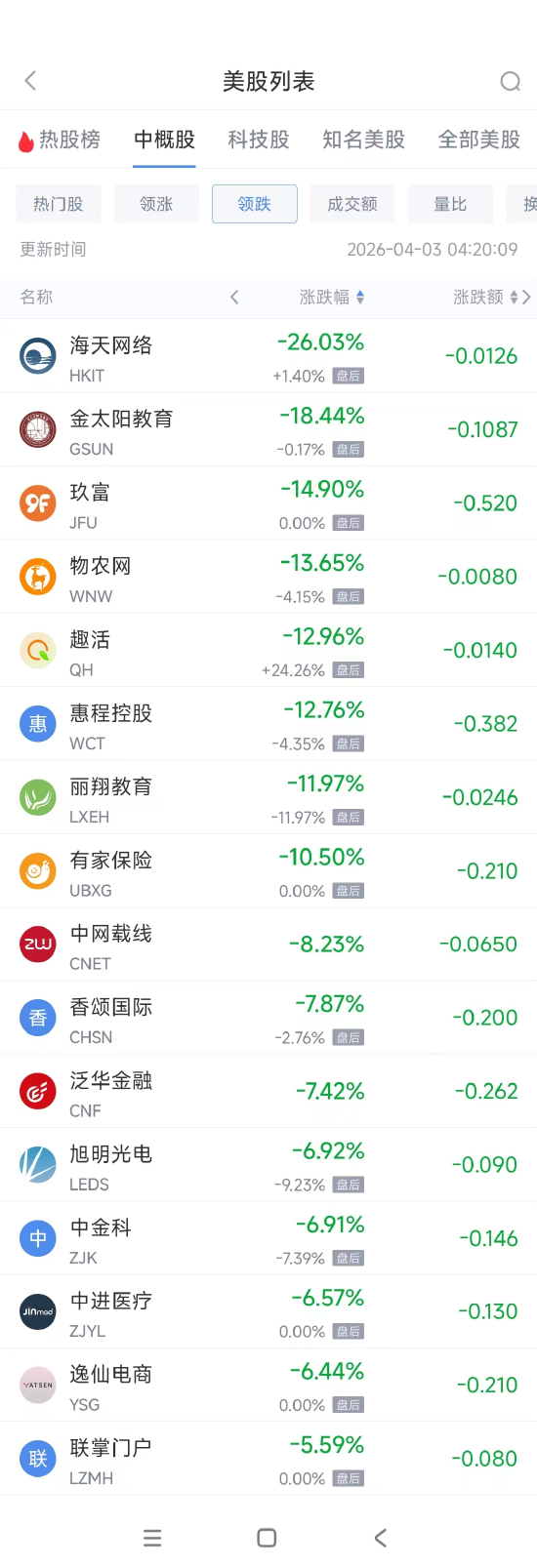 April 3 saw China concept stocks in popularity rise or fall unevenly, with the Nasdaq China Golden Dragon Index (HXC) down 0.34%.
