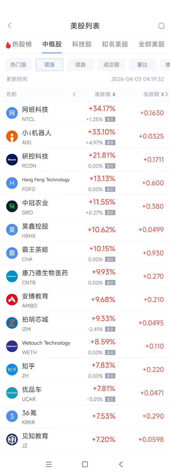 Among the stocks that rose (ranked from highest to lowest by market cap), NetEase rose 0.13%, China Telecom rose 0.01%, Trip.com rose 1.39%, Futu Holdings rose 0.09%, ZTO Express rose 0.65%, Li Auto rose 0.49%, XPeng rose 1.09%, Huazhu Hotel Group rose 1.18%, NIO rose 1.45%, China New City Rural rose 2.80%, Bilibili rose 0.70%, Boss Zhipin rose 0.30%, WSP Holdings rose 0.88%, Pony.ai rose 0.11%, Hesai Technology rose 0.63%, Huanxi rose 0.34%.