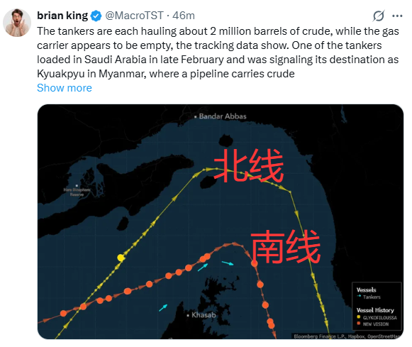 The two tankers each carry about 2 million barrels of crude oil. One of them loaded in late February in Saudi Arabia, with the destination shown as the Kyaukpyu Port in Myanmar—this port connects to a pipeline serving western China; the other loads Abu Dhabi crude oil, and its destination has not been disclosed. Tracking data for the LNG carrier shows it is in a loaded-out (empty) state.