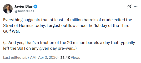 Energy and commodities reporter Javier Blas posted on X: “All signs indicate that today at least around 4 million barrels of crude oil have flowed out of the Strait of Hormuz—this is the largest single-day outflow since the first day of the third day of the Gulf War.”