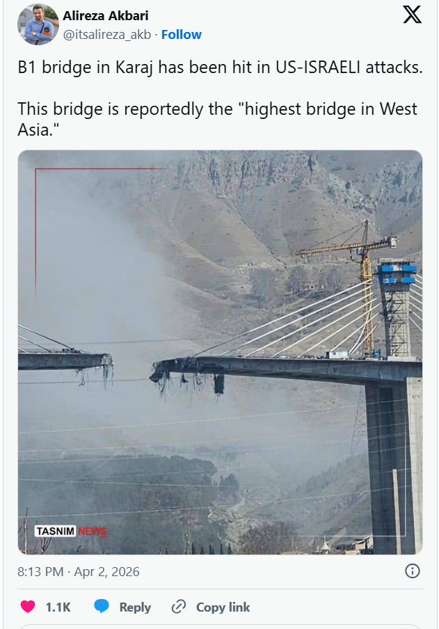 After that, Iran’s highest bridge—connecting Tehran and Karaj—was destroyed. According to a report cited by Xinhua News Agency, the target of the U.S.-led strike that day was the Beykaye Road Bridge. The bridge is a flagship project of Iran’s engineering community, known as one of the most complex engineering achievements in the world, and it is core infrastructure for the Tehran–Karaj transportation corridor. It was originally planned to be officially put into operation soon.