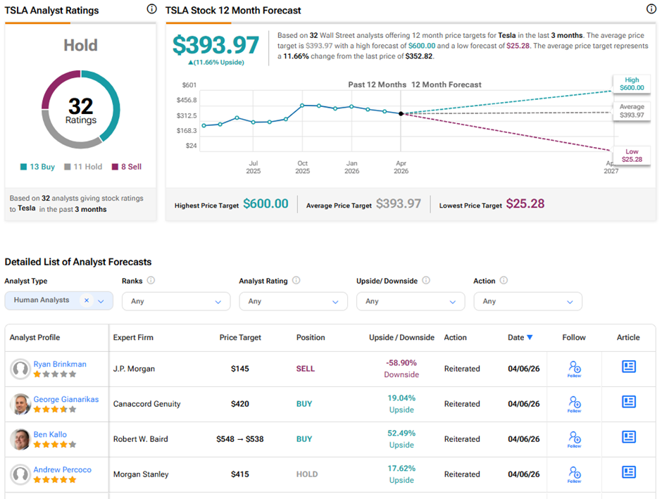 Tesla TSLA -2.15% ▼ missed Q1 2026 auto delivery estimates. Since the April 2 report, shares have dropped 7.6%. Wall Street analysts have given mixed reactions: some have cut price targets, while others have stuck to Buy, Hold, or Sell ratings. Amid the noise, Wedbush’s Daniel Ives, a longtime Tesla bull, stays bullish about its AI potential. He reiterated a Buy rating and Street-high price target of $600, implying 70.1% upside potential.
