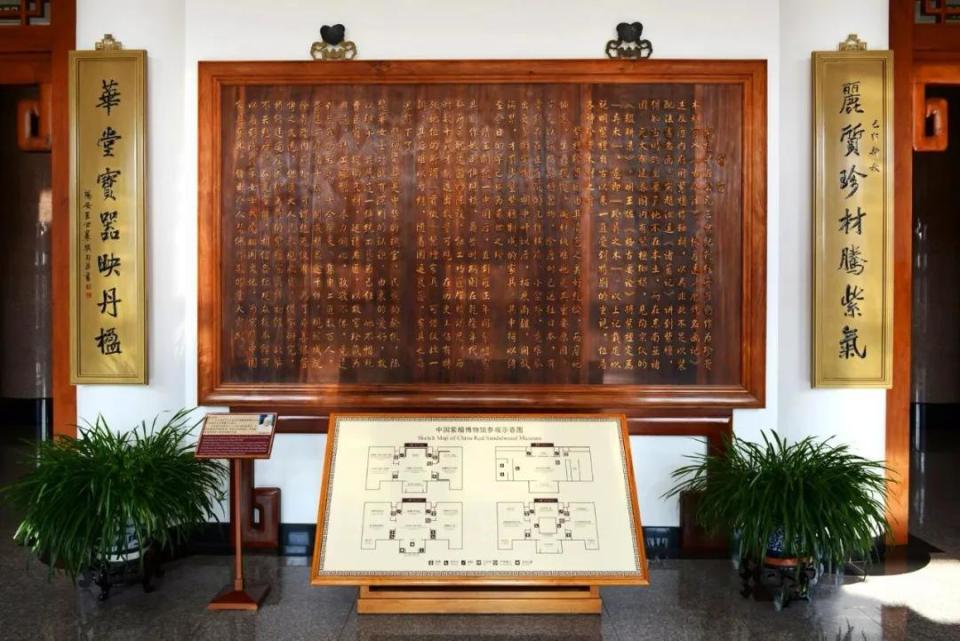 The moment you enter the main gate, on the wall directly ahead, there is a zitan-themed couplet hung—written by cultural relic expert Wang Shixiang—“Fine quality and precious materials rise with purple air; the splendid hall and treasured objects reflect red pillars.” The first characters of the upper and lower couplets are, respectively, “Li” and “Hua.”